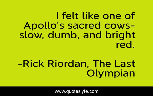 This page presents the quote "I felt like one of Apollo's sacred cows- slow, dumb, and bright red.". Author of this quote is Rick Riordan, The Last Olympian. This quote is about simile, humor,.