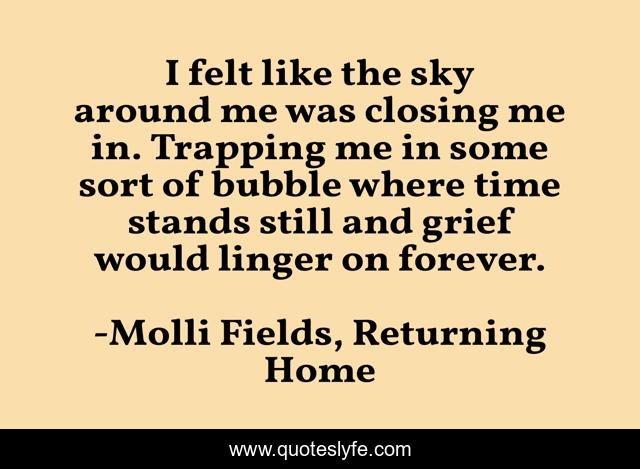 This page presents the quote "I felt like the sky around me was closing me in. Trapping me in some sort of bubble where time stands still and grief would linger on forever.". Author of this quote is Molli Fields, Returning Home. This quote is about grief, sadness, death,.