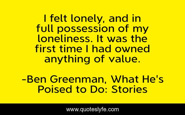 This page presents the quote "I felt lonely, and in full possession of my loneliness. It was the first time I had owned anything of value.". Author of this quote is Ben Greenman, What He's Poised to Do: Stories. This quote is about loneliness, solitude, melancholy, ownership,.