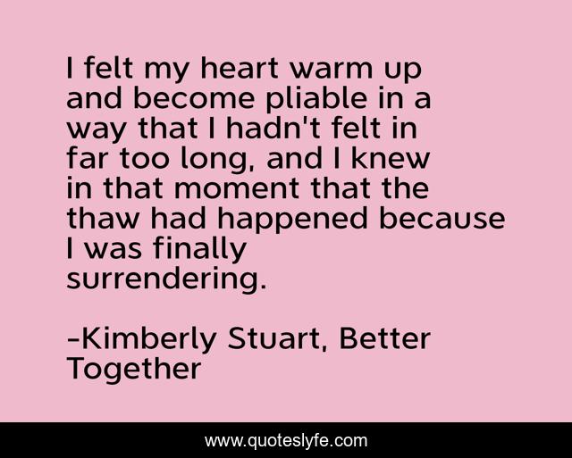 This page presents the quote "I felt my heart warm up and become pliable in a way that I hadn't felt in far too long, and I knew in that moment that the thaw had happened because I was finally surrendering.". Author of this quote is Kimberly Stuart, Better Together. This quote is about romance, christian, contemporary-romance, fiction,.