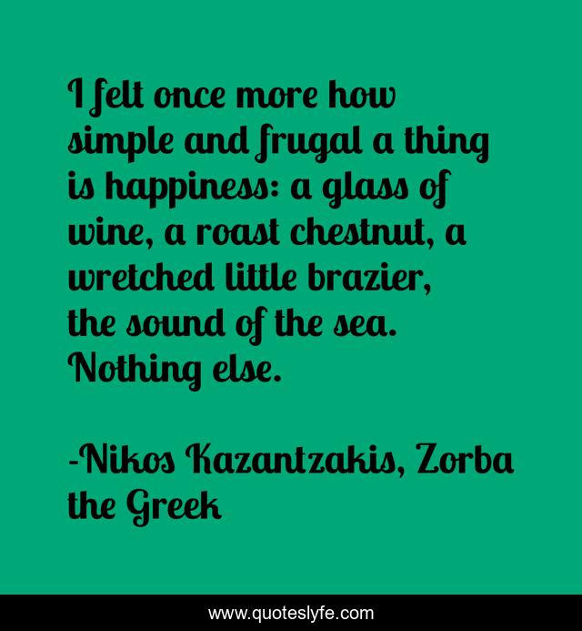 This page presents the quote "I felt once more how simple and frugal a thing is happiness: a glass of wine, a roast chestnut, a wretched little brazier, the sound of the sea. Nothing else.". Author of this quote is Nikos Kazantzakis, Zorba the Greek. This quote is about life, happiness, sea,.