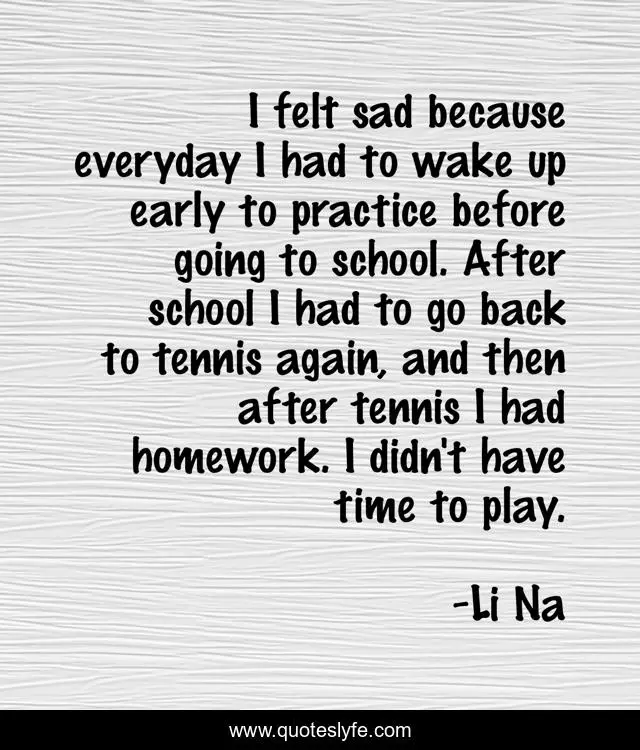 This page presents the quote "I felt sad because everyday I had to wake up early to practice before going to school. After school I had to go back to tennis again, and then after tennis I had homework. I didn't have time to play.". Author of this quote is Li Na. This quote is about school, tennis, time,.