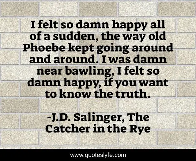 This page presents the quote "I felt so damn happy all of a sudden, the way old Phoebe kept going around and around. I was damn near bawling, I felt so damn happy, if you want to know the truth.". Author of this quote is J.D. Salinger, The Catcher in the Rye. This quote is about bawling, kept, around, going, felt, near, sudden, happy,.