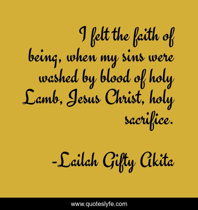 This page presents the quote "I felt the faith of being, when my sins were washed by blood of holy Lamb, Jesus Christ, holy sacrifice.". Author of this quote is Lailah Gifty Akita. This quote is about faith, christian, sacrifice, sins, inspirational, enthusiasm,.