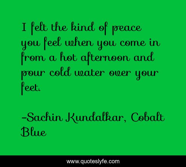 This page presents the quote "I felt the kind of peace you feel when you come in from a hot afternoon and pour cold water over your feet.". Author of this quote is Sachin Kundalkar, Cobalt Blue. This quote is about home, cold, peace, india,.