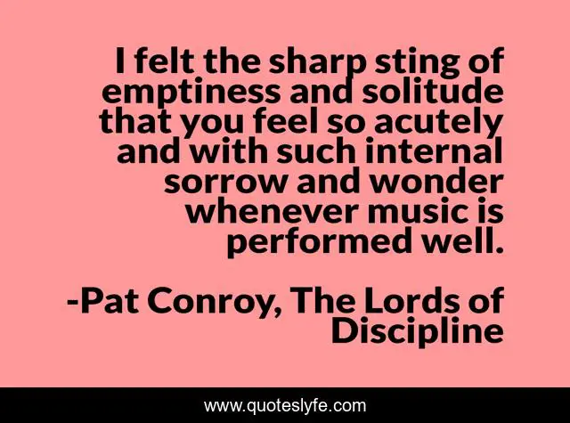 This page presents the quote "I felt the sharp sting of emptiness and solitude that you feel so acutely and with such internal sorrow and wonder whenever music is performed well.". Author of this quote is Pat Conroy, The Lords of Discipline. This quote is about art, sensitivity, music, beauty,.