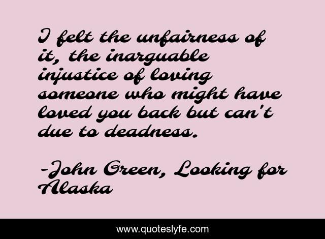 This page presents the quote "I felt the unfairness of it, the inarguable injustice of loving someone who might have loved you back but can't due to deadness.". Author of this quote is John Green, Looking for Alaska. This quote is about death, unfair,.