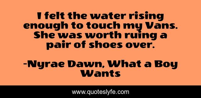 This page presents the quote "I felt the water rising enough to touch my Vans. She was worth ruing a pair of shoes over.". Author of this quote is Nyrae Dawn, What a Boy Wants. This quote is about vans, love, shoes, affection, worth,.