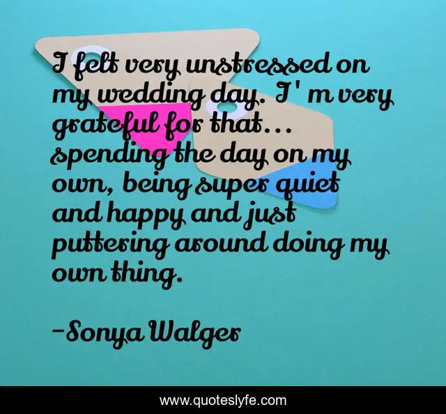 This page presents the quote "I felt very unstressed on my wedding day. I'm very grateful for that... spending the day on my own, being super quiet and happy and just puttering around doing my own thing.". Author of this quote is Sonya Walger. This quote is about day, grateful, happy,.