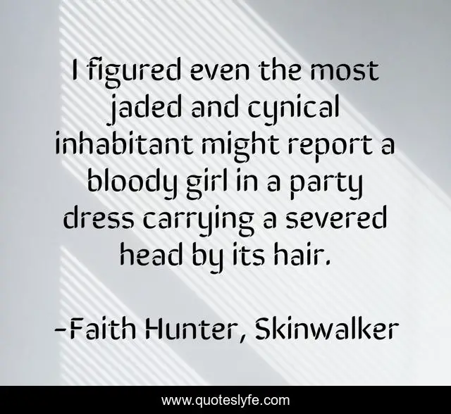 This page presents the quote "I figured even the most jaded and cynical inhabitant might report a bloody girl in a party dress carrying a severed head by its hair.". Author of this quote is Faith Hunter, Skinwalker. This quote is about jane-yellowrock, skinwalker, urban-fantasy, blood, paranormal-romance,.