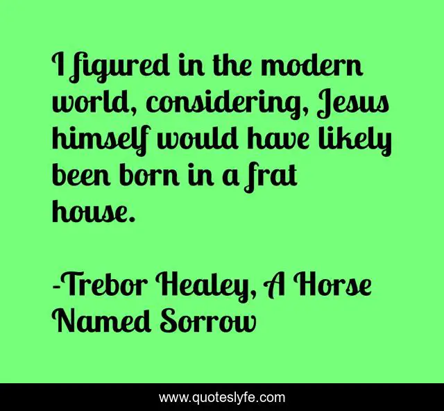 This page presents the quote "I figured in the modern world, considering, Jesus himself would have likely been born in a frat house.". Author of this quote is Trebor Healey, A Horse Named Sorrow. This quote is about frat-house, jesus,.