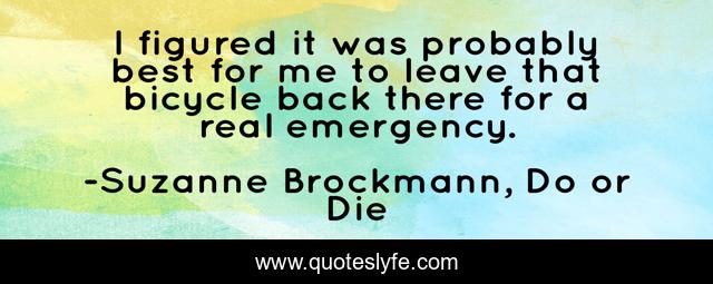 This page presents the quote "I figured it was probably best for me to leave that bicycle back there for a real emergency.". Author of this quote is Suzanne Brockmann, Do or Die. This quote is about banter, romantic-suspense,.