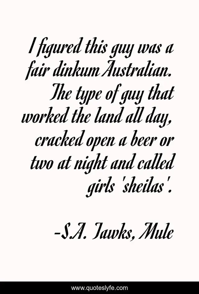 This page presents the quote "I figured this guy was a fair dinkum Australian. The type of guy that worked the land all day, cracked open a beer or two at night and called girls 'sheilas'.". Author of this quote is S.A. Tawks, Mule. This quote is about bali, drugs, travel, indonesia, crime, adventure,.