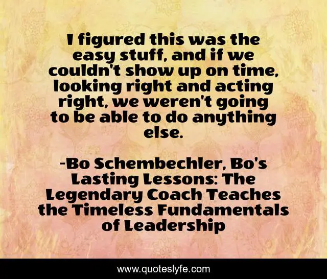 This page presents the quote "I figured this was the easy stuff, and if we couldn't show up on time, looking right and acting right, we weren't going to be able to do anything else.". Author of this quote is Bo Schembechler, Bo's Lasting Lessons: The Legendary Coach Teaches the Timeless Fundamentals of Leadership. This quote is about punctuality, team, winning,.