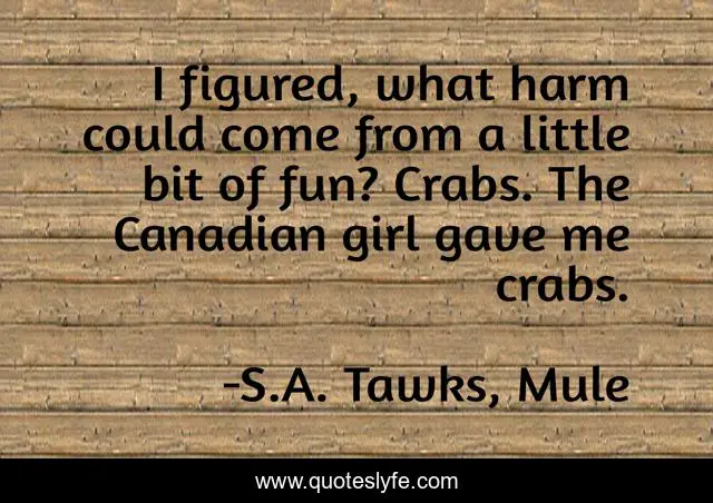 This page presents the quote "I figured, what harm could come from a little bit of fun? Crabs. The Canadian girl gave me crabs.". Author of this quote is S.A. Tawks, Mule. This quote is about bali, drugs, travel, indonesia, crime, adventure,.