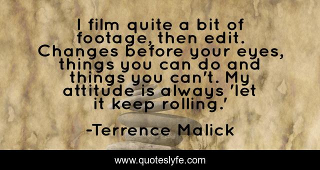 This page presents the quote "I film quite a bit of footage, then edit. Changes before your eyes, things you can do and things you can't. My attitude is always 'let it keep rolling.'". Author of this quote is Terrence Malick. This quote is about eyes, changes,.