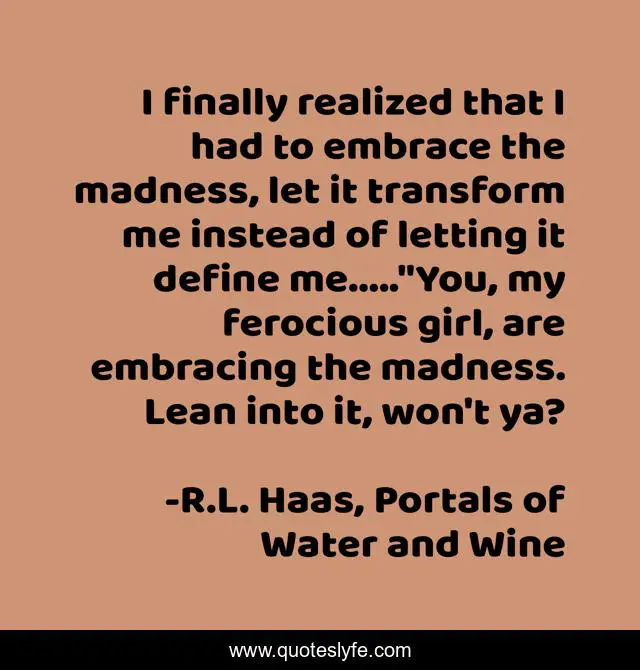 This page presents the quote "I finally realized that I had to embrace the madness, let it transform me instead of letting it define me....."You, my ferocious girl, are embracing the madness. Lean into it, won't ya?". Author of this quote is R.L. Haas, Portals of Water and Wine. This quote is about madness, madness-and-sanity,.