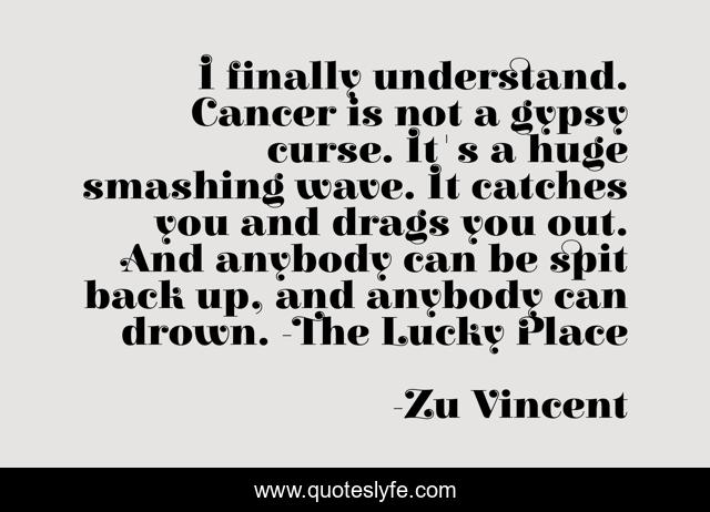 This page presents the quote "I finally understand. Cancer is not a gypsy curse. It's a huge smashing wave. It catches you and drags you out. And anybody can be spit back up, and anybody can drown. -The Lucky Place". Author of this quote is Zu Vincent. This quote is about sadness, radiation, cancer, the-lucky-place,.