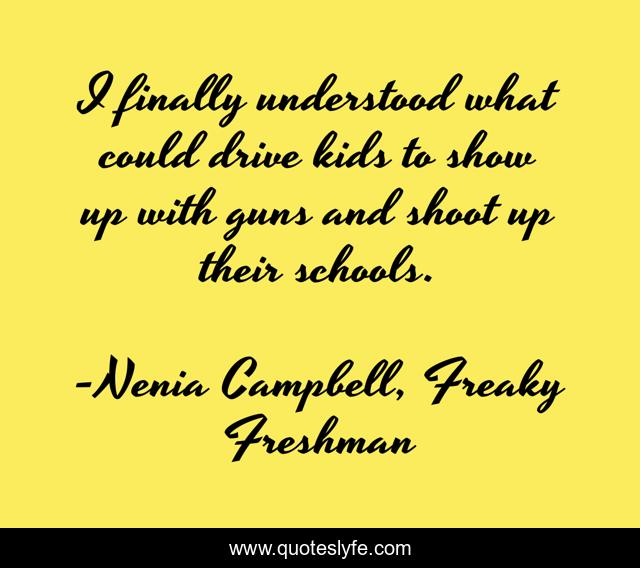 This page presents the quote "I finally understood what could drive kids to show up with guns and shoot up their schools.". Author of this quote is Nenia Campbell, Freaky Freshman. This quote is about violence, bullying, sadness, mental-illness, anger, school-shooting, hatred, depression,.