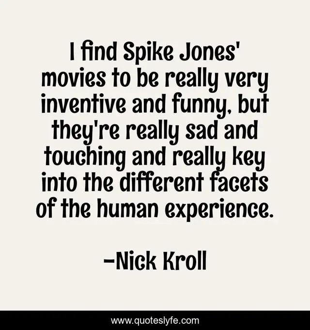This page presents the quote "I find Spike Jones' movies to be really very inventive and funny, but they're really sad and touching and really key into the different facets of the human experience.". Author of this quote is Nick Kroll. This quote is about funny, comedy, experience, movies,.