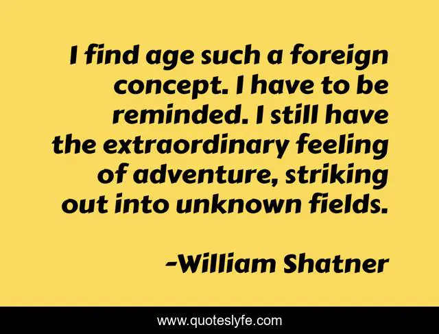 This page presents the quote "I find age such a foreign concept. I have to be reminded. I still have the extraordinary feeling of adventure, striking out into unknown fields.". Author of this quote is William Shatner. This quote is about unknown, adventure,.