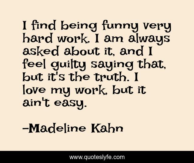 This page presents the quote "I find being funny very hard work. I am always asked about it, and I feel guilty saying that, but it's the truth. I love my work, but it ain't easy.". Author of this quote is Madeline Kahn. This quote is about work, love, affection, hard work,.