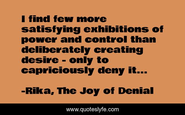 This page presents the quote "I find few more satisfying exhibitions of power and control than deliberately creating desire - only to capriciously deny it...". Author of this quote is Rika, The Joy of Denial. This quote is about denial, submission, tease, d-s, t-d, dominance,.