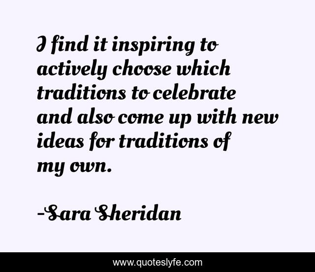 This page presents the quote "I find it inspiring to actively choose which traditions to celebrate and also come up with new ideas for traditions of my own.". Author of this quote is Sara Sheridan. This quote is about christmas, celebration, tradition, holidays,.
