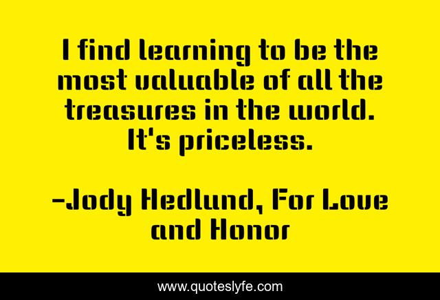 This page presents the quote "I find learning to be the most valuable of all the treasures in the world. It's priceless.". Author of this quote is Jody Hedlund, For Love and Honor. This quote is about treasure, learning,.