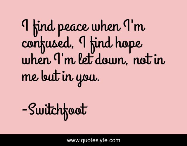 This page presents the quote "I find peace when I'm confused, I find hope when I'm let down, not in me but in you.". Author of this quote is Switchfoot. This quote is about affection, peace, love, hope, lyrics,.