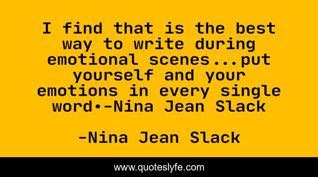 This page presents the quote "I find that is the best way to write during emotional scenes...put yourself and your emotions in every single word.-Nina Jean Slack". Author of this quote is Nina Jean Slack. This quote is about love, author, writer, emotions, writing, writers, words, authors, emotional,.