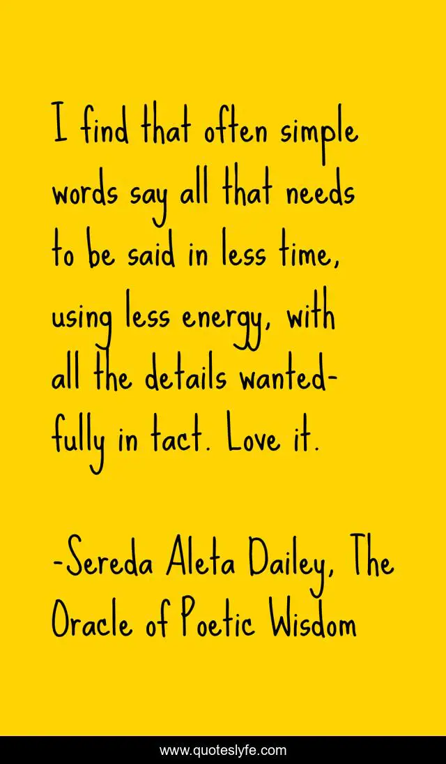 This page presents the quote "I find that often simple words say all that needs to be said in less time, using less energy, with all the details wanted- fully in tact. Love it.". Author of this quote is Sereda Aleta Dailey, The Oracle of Poetic Wisdom. This quote is about simplicity, wisdom-inspirational, conversation, communication, practical-living, balance,.