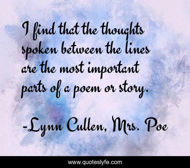 This page presents the quote "I find that the thoughts spoken between the lines are the most important parts of a poem or story.". Author of this quote is Lynn Cullen, Mrs. Poe. This quote is about poem, poetry,.