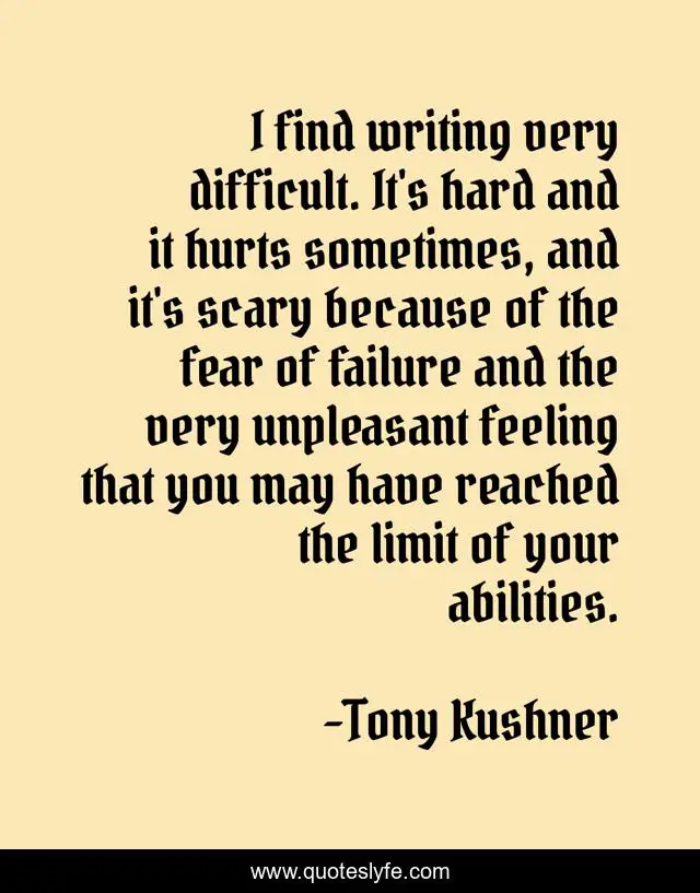 This page presents the quote "I find writing very difficult. It's hard and it hurts sometimes, and it's scary because of the fear of failure and the very unpleasant feeling that you may have reached the limit of your abilities.". Author of this quote is Tony Kushner. This quote is about fear, writing,.