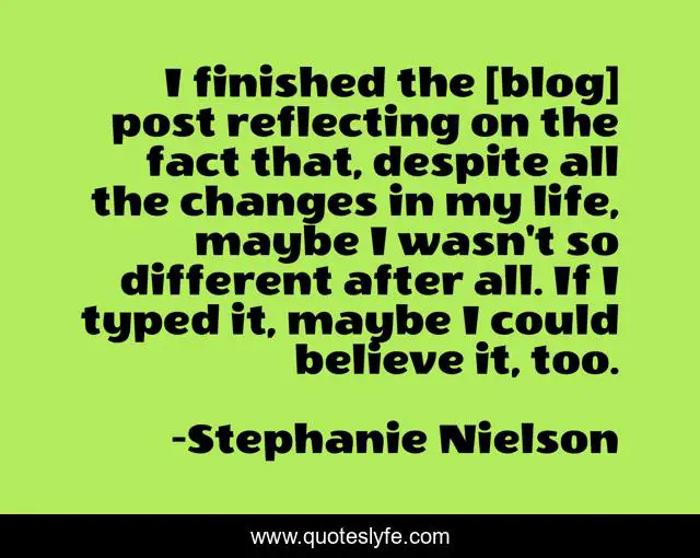 This page presents the quote "I finished the [blog] post reflecting on the fact that, despite all the changes in my life, maybe I wasn't so different after all. If I typed it, maybe I could believe it, too.". Author of this quote is Stephanie Nielson. This quote is about life, writing, accepting-change, hope, time, blogging, change,.