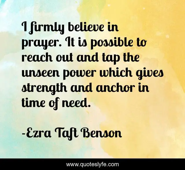 This page presents the quote "I firmly believe in prayer. It is possible to reach out and tap the unseen power which gives strength and anchor in time of need.". Author of this quote is Ezra Taft Benson. This quote is about believe, power, time,.