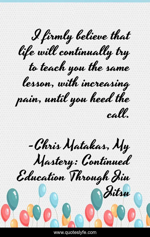 This page presents the quote "I firmly believe that life will continually try to teach you the same lesson, with increasing pain, until you heed the call.". Author of this quote is Chris Matakas, My Mastery: Continued Education Through Jiu Jitsu. This quote is about lessons, life, pain, personal-growth, growth, awareness,.