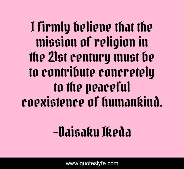 This page presents the quote "I firmly believe that the mission of religion in the 21st century must be to contribute concretely to the peaceful coexistence of humankind.". Author of this quote is Daisaku Ikeda. This quote is about believe, mission, peaceful,.