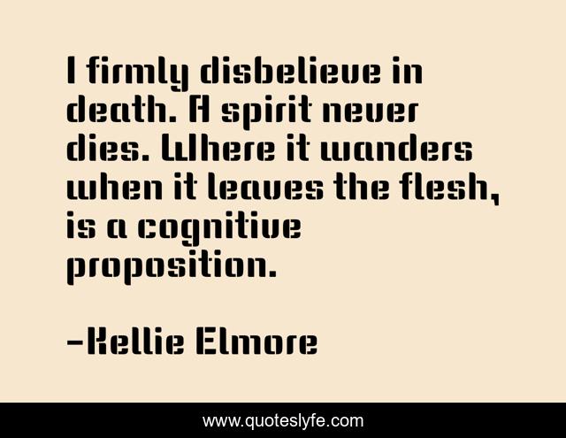 "Kellie Elmore Quotes." Quoteslyfe.com, 2025. Mon. 08 Dec. 2025. <https://www.quoteslyfe.com/quote/I-firmly-disbelieve-in-death-A-spirit-105934>.