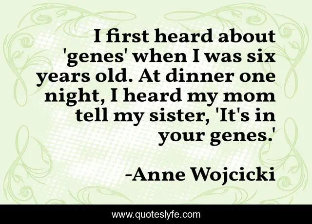 This page presents the quote "I first heard about 'genes' when I was six years old. At dinner one night, I heard my mom tell my sister, 'It's in your genes.'". Author of this quote is Anne Wojcicki. This quote is about sister, dinner, night,.