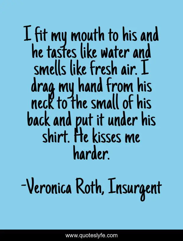This page presents the quote "I fit my mouth to his and he tastes like water and smells like fresh air. I drag my hand from his neck to the small of his back and put it under his shirt. He kisses me harder.". Author of this quote is Veronica Roth, Insurgent. This quote is about water, love, tobias-and-tris, affection, divergent,.