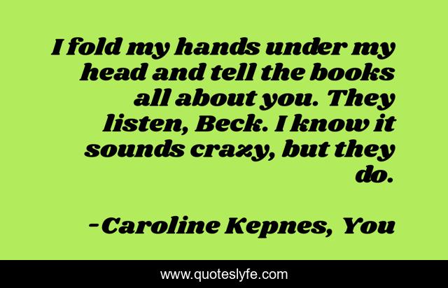 This page presents the quote "I fold my hands under my head and tell the books all about you. They listen, Beck. I know it sounds crazy, but they do.". Author of this quote is Caroline Kepnes, You. This quote is about caroline-kepnes, books, joe,.