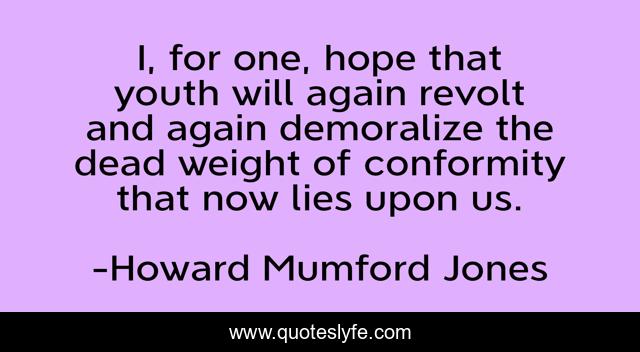 This page presents the quote "I, for one, hope that youth will again revolt and again demoralize the dead weight of conformity that now lies upon us.". Author of this quote is Howard Mumford Jones. This quote is about youth, conformity,.