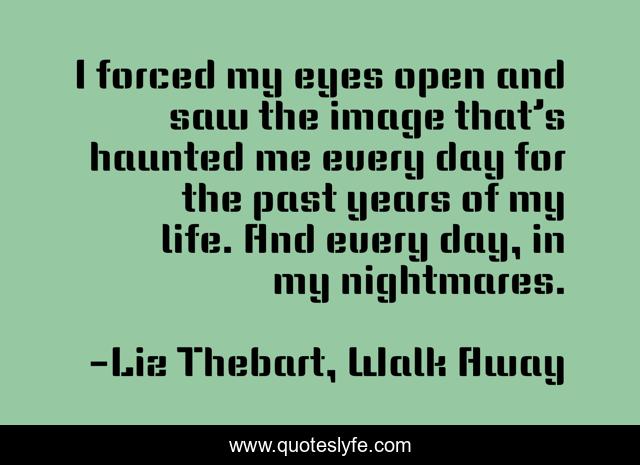 This page presents the quote "I forced my eyes open and saw the image that’s haunted me every day for the past years of my life. And every day, in my nightmares.". Author of this quote is Liz Thebart, Walk Away. This quote is about drug-addiction, drugs, drugs-and-alcohol, depression, self-help,.