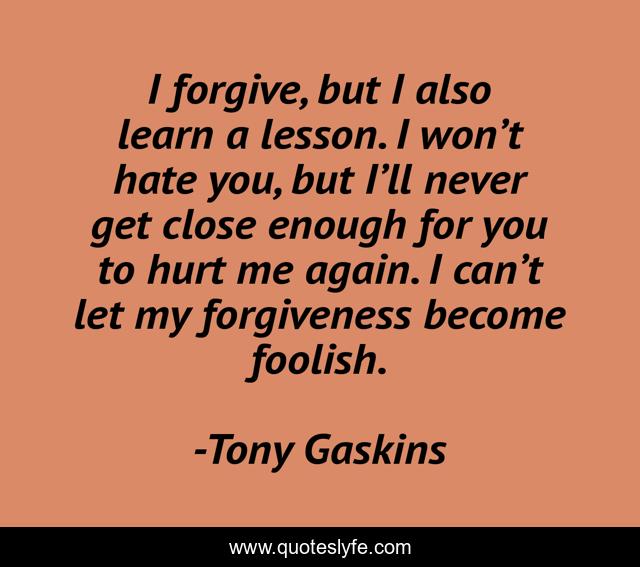 This page presents the quote "I forgive, but I also learn a lesson. I won’t hate you, but I’ll never get close enough for you to hurt me again. I can’t let my forgiveness become foolish.". Author of this quote is Tony Gaskins. This quote is about forgiveness, foolish, hate,.