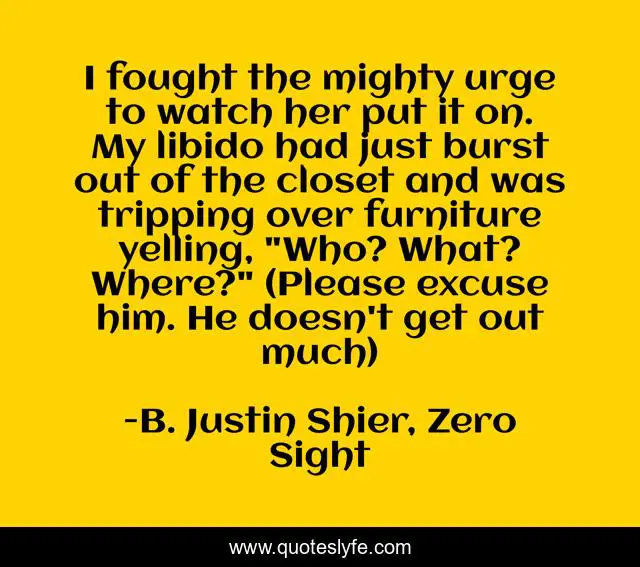 This page presents the quote "I fought the mighty urge to watch her put it on. My libido had just burst out of the closet and was tripping over furniture yelling, "Who? What? Where?" (Please excuse him. He doesn't get out much)". Author of this quote is B. Justin Shier, Zero Sight. This quote is about humor, humour,.