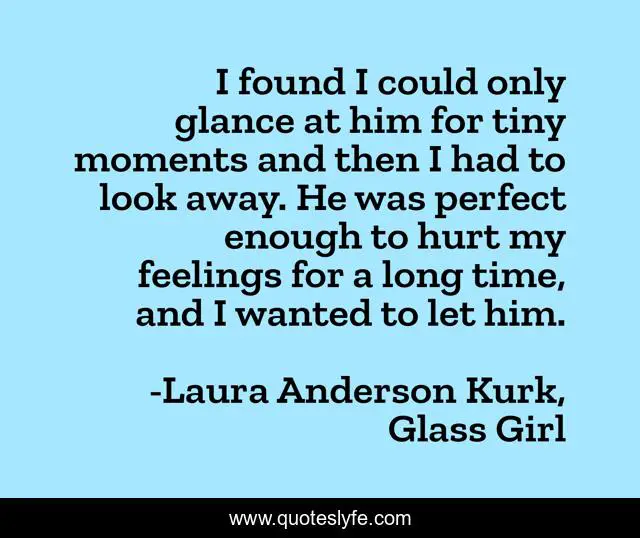 This page presents the quote "I found I could only glance at him for tiny moments and then I had to look away. He was perfect enough to hurt my feelings for a long time, and I wanted to let him.". Author of this quote is Laura Anderson Kurk, Glass Girl. This quote is about glass-girl, laura-anderson-kurk, love, teen-fiction, high-school, meg-kavanagh, ya-fiction, wyoming, young-adult-fiction,.