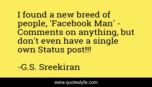 This page presents the quote "I found a new breed of people, 'Facebook Man' - Comments on anything, but don't even have a single own Status post!!!". Author of this quote is G.S. Sreekiran. This quote is about business, life-lessons, people,.