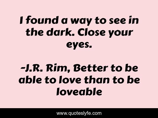 This page presents the quote "I found a way to see in the dark. Close your eyes.". Author of this quote is J.R. Rim, Better to be able to love than to be loveable. This quote is about eyes, open-your-heart, darkness, dark, seeing-things-in-a-different-way, find-a-way, close-your-eyes,.