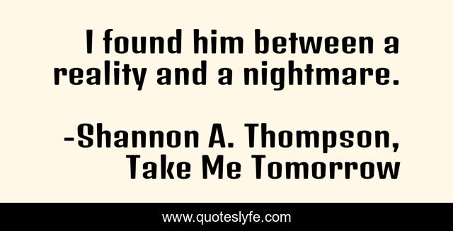 This page presents the quote "I found him between a reality and a nightmare.". Author of this quote is Shannon A. Thompson, Take Me Tomorrow. This quote is about heartache, lovers, love, dystopian, heartbreak, reality, nightmares, young-love, tragic,.